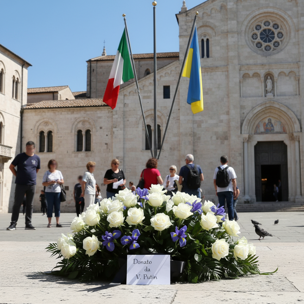 San Nicola, Bari commemora l’invasione in Ucraina con bandiera a mezz’asta e fiori donati da Putin Febbraio 24, 2026